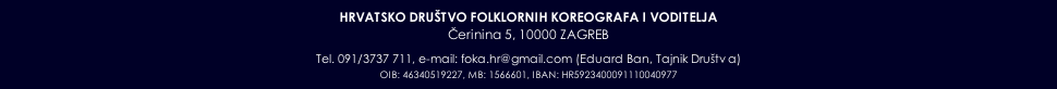 Bilten HDFKiV HRVATSKO DRUŠTVO FOLKLORNIH KOREOGRAFA I VODITELJA Čerinina 5 10000 ZAGREB  Tel. 091/3737 711  e-mail: foka.hr@gmail.com  (Eduard Ban, tajnik Društva)        OIB: 46340519227  MB: 1566601  IBAN: HR5923400091110040977